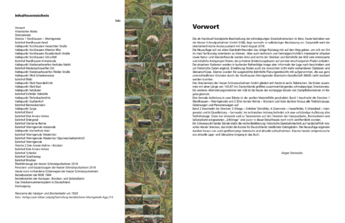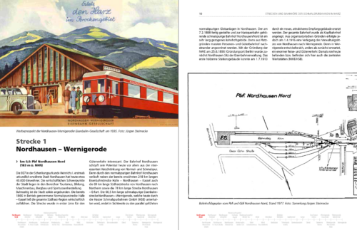 Die als Handbuch konzipierte Beschreibung der schmalspurigen Eisenbahnstrecken im Harz, heute betrieben von der Harzer Schmalpurbahnen GmbH (HSB), bildet den streckentechnischen Ausbauzustand mit Stand August 2018 ab. Das komplette Streckennetz der HSB wird erstmals aus der „Vogelperspektive“ visualisiert. Dafür kommen großformatige aktuelle und historische Luftaufnahmen zum Einsatz. Bestandteil des Buches sind die Gleispläne aller Bahnhöfe auf dem Harzer Schmalspurnetz. Die einzelnen Stationen werden in laufender Reihenfolge knapp aber informativ der Lage nach beschrieben und um historische Daten ergänzt. Erwähnung finden auch die inzwischen nicht mehr vorhandenen Stationen und Gleisanschlüsse. Ebenso werden für ausgewählte Bahnhöfe Planungsentwürfe mit aufgenommen, die aus ganz unterschiedlichen Gründen durch die Nordhausen-Wernigeroder Eisenbahn-Gesellschaft (NWE) nicht realisiert werden konnten. Darunter befinden sich echte Raritäten, wie beispielsweise unveröffentlichte Bauentwürfe für die Bahnhöfe Goetheweg und Brocken von 1922, der Entwurf für ein Bahnhofshotel am Bahnhof Schierke von 1934 und auch die Pläne des Architekten Fritz Höger für den Neubau des Bahnhofs Westentor von 1935. Ausnahmslos alle Haltepunkte, Bahnhöfe und Werksanschlüsse werden umfassend bebildert (940 Fotos). Im historischen Kontext nicht länger ausgespart bleiben auch die infrastrukturellen Streckenerweiterungen der NWE im Zuge der U-Verlagerungsprojekte im Raum Niedersachswerfen durch die Nationalsozialisten. Flankierend dazu sind einige NS-Bunkerbauvorhaben, KZ-Außenlager und Lager des Reichsarbeitsdienstes (beispielsweise „M6“, „1/134“, „3/134“, „Anhydrit-Ost“, „T 90/44“, „Achat“ oder „Mergel“) mit aufgenommen worden, soweit sich ein direkter Bahnbezug nachweisen ließ.